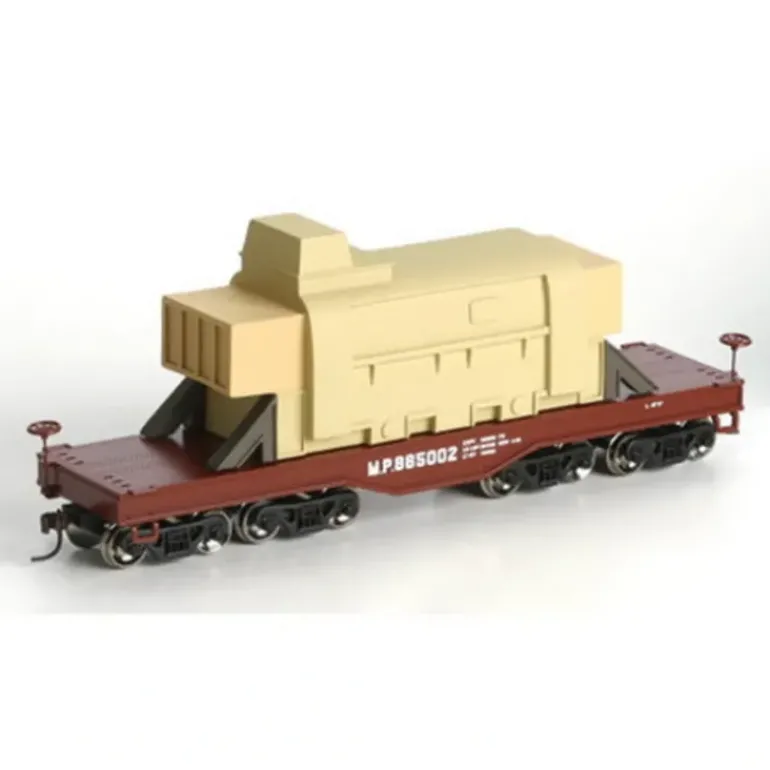 In order to transport ultra-heavy loads cross country the railroad industry has developed a number of specialized heavy-duty flat cars. One of the most common examples of this unique category of railcar is the four truck cast steel frame flat car. The four trucks spread out over the rails to minimize track damage. Due to their robust construction these cars have had a long tenure on the rails with many operating over fifty years before beign rebuilt and continuing in service. This flatcar is fully assembled and ready for your layout. It features a removable heavy machinery load, razor sharp painting and printing, machined RP25 profile metal wheels, McHenry scale knuckle spring couplers, and it is weighted for optimal performance.
