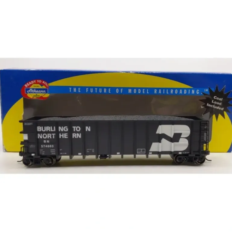 Here is a Athearn 95766 Burlington Northern Thrall High-Side Coal Gondola #574683. This gondola comes fully assembled and ready to operate. It features new wire and plastic handrails, stirrup steps, ladders, underbody details, a removable cast coal load, weights for optimal performance, machined RP25 profile metal wheels, and McHenry scale knuckle spring couplers.