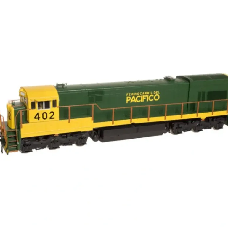 This is Atlas HO Scale Ready-to-Run U30C Phase-III – Ferrocarril Del Pacifico #402. Features: Adirondack floating bolster trucks with or without bearing caps as appropriate per railroad Coupler pocket designed to accept AccuMate Proto-couplers Golden-white LEDs Antenna detail where appropriate per road name Realistic die-cast underframe Five-pole skewed armature motor with dual flywheels for optimum performance at all speeds Separately-installed scale windshield wipers, metal grab irons and fine scale handrails Directional lighting With or without nose headlight as appropriate per railroad Non-operating cab roof-top beacon detail where appropriate per road name Detailed crew members Marker lights with separate lenses Snowplow Separately-applied drop steps Recommended radius: 22. Additional Information: Built by General Electric between 1966 and 1976, the six-axle, 3000-h.p. U30C locomotive was primarily used in heavy-haul road freight and unit train service. This model represents the more common Phase III carbody style, which applies to most locomotives produced after 1970.