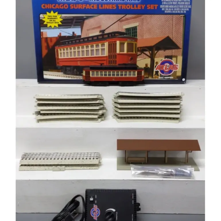 Here is a Atlas 1009103 Chicago Surface Lines O Gauge Trolley Set. Included in this set is the Chicago Surface Lines Motorized Trolley, Station Platform (Item #66902 built-up), 40 X 50 Oval Layout, and a 30 Watt Transformer. Please see my photos for additional features.
