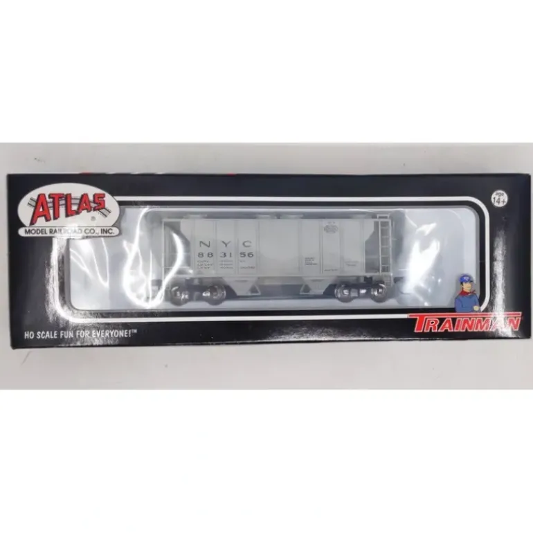 Here is an Atlas 11305 HO Scale New York Central PS-2 Covered Hopper #883156. Covered hoppers are a relatively new car family. The AAR considered these special cars until the 1980s when they finally got their own car type code category. These early covered hopper designs were built primarily for more efficient cement loading and unloading (previously cement was bagged and placed in box cars). This two-bay covered hopper car design was built by Pullman-Standard starting in the late 1940s with production continuing into the 1950s. This car features eight round roof hatches for quick loading. Two large gravity gates were used to discharge the commodity as quickly as possible. Capacity is rated at 2,003 cubic foot. Features: 50-ton friction bearing or 70-ton roller bearing trucks (as appropriate by road name)Detailed brake gearAccumate couplersPrototypical painting and printing