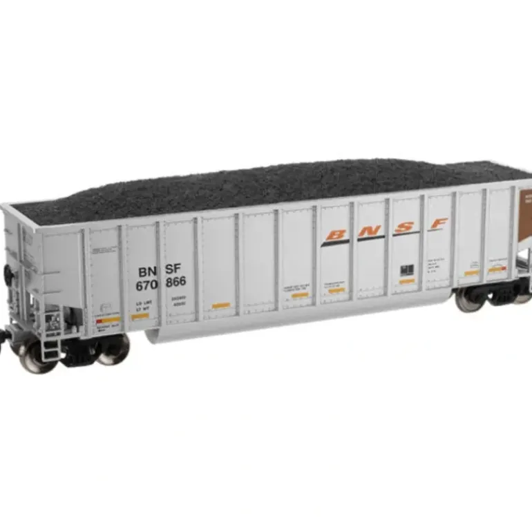This is Atlas 20000488 Coal Gon BNSF #670866. Transporting coal on the railways has been around as long as the railways. Two major types of cars emerged for hauling coal; hoppers and gondolas. The earlier cars were made of wood, then steel, and later aluminum. The lighter weight of aluminum allows greater lading and cubic foot capacities ideal for bulk minerals transport. By the 1980s, both coal hoppers and coal gondolas were using aluminum bodies in their construction.