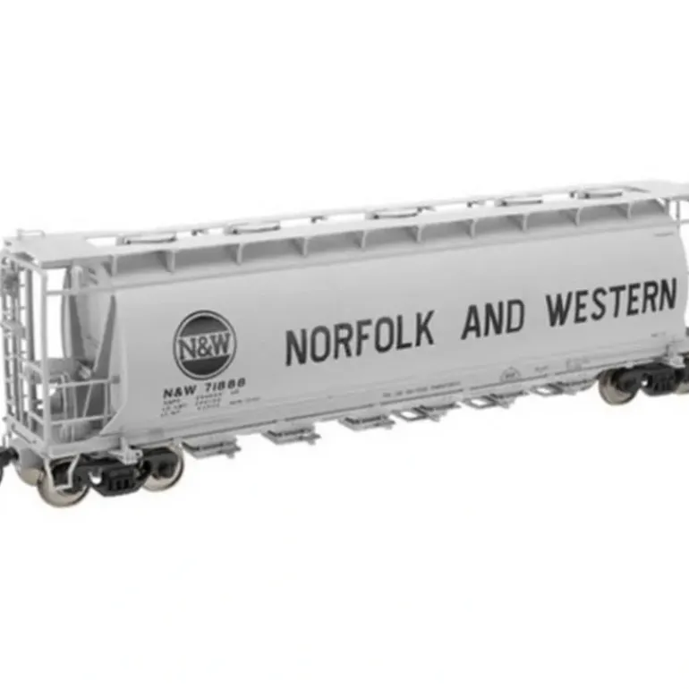 This is an Atlas 20000546 HO Scale N&W 6-Bay Cylindrical Hopper #71888. Introduced in 1961 by ACF to haul sand, clay, salt, grain and bulk plastics, the Cylindrical Hopper was the first commercially successful tank-type covered hopper car design. A few of the more than 4,000 cars of this type built through 1966 can still be seen in service today across the United States.