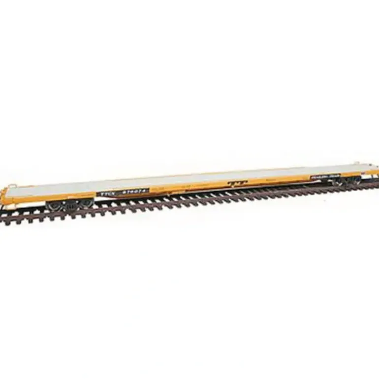 The ACF 89′ 4 flat car was introduced in the late 60s as a result of a continuing need for more intermodal platform capacity. The Atlas model is based on the 1973 version that was originally designed to carry two trailers or combinations with containers. The cars have been used by Trailer Train and various railroads in intermodal service since that time. Many of these were modified in the late 80s to accept longer trailers. Most of those remaining in TTX service, today, have been modified with three hitches to accommodate up to three shorter package trailers. It features container pedestals, correct model year jack pads, and AccuMate couplers.