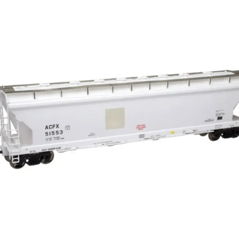 This is Atlas HO Scale ACF 4-Bay Centerflow Pressureaide Covered Hopper – ACFX (NKC 1993 Repaint) #51555. Features: Etched metal roof walks Detailed brake gear with scale piping Blackened metal wheels Accurate painting and printing 100-ton roller-bearing trucks and body mounted AccuMate couplers with screw-attached coupler pockets. Additional Information: Atlas’ Center Flow Pressureaide Car is modeled after ACF’s freight car designed to handle dry, powdered commodities for fast, efficient unloading.