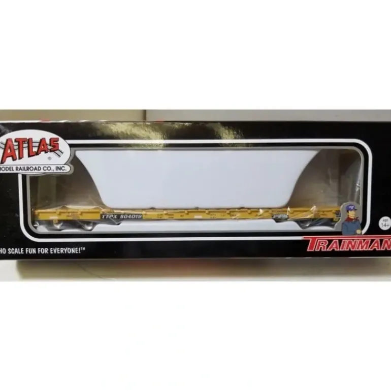 This is an Atlas 20006444 HO Scale TTX TM 68′ Bulkhead Flat Car #804019. Features: Side stake pockets, Simulated tie-loops, Fishbelly center-sill, & Prototypical pull-plates and lift rings.