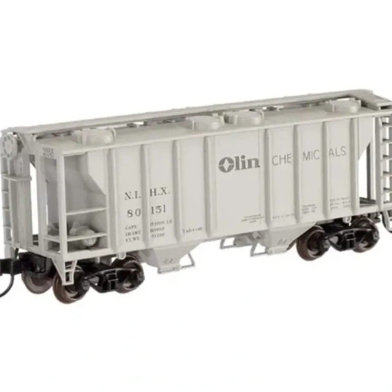 This is an Atlas 31948 N Scale Olin Chemical Trainman PS-2 2-Bay Covered Hopper #80154. This car features realistic Accu-mate knuckle couplers, prototypically-accurate paint and lettering, and lots of underframe and end detail. (different road number shown)