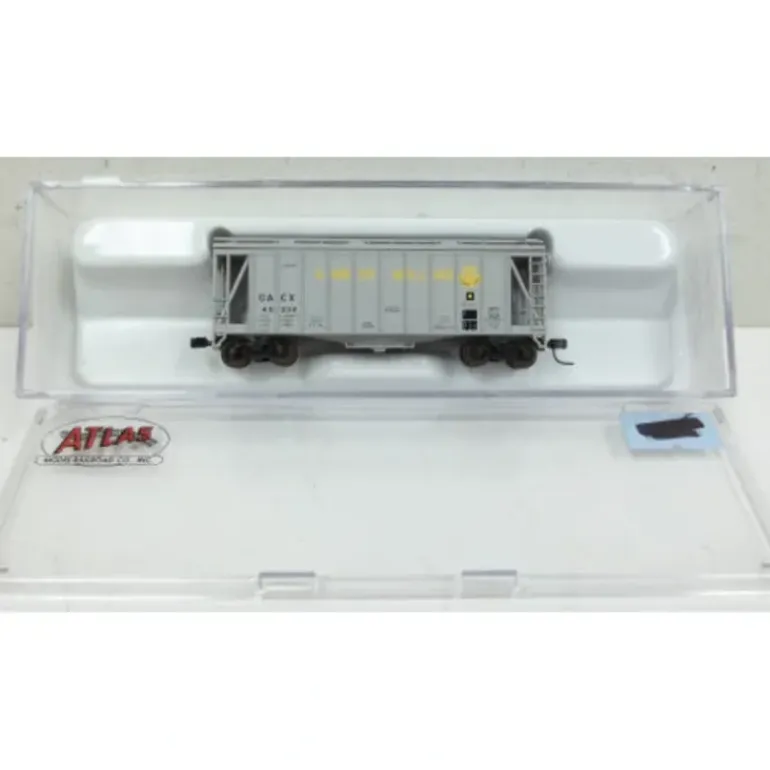 Here is an Atlas 38681 N Scale Amber Milling #45332 Airslide Hopper. Features include plastic construction, plastic trucks, plastic couplers, and plastic wheels.