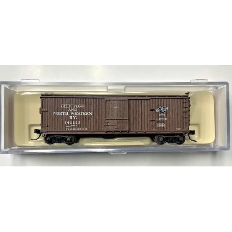 Here is an Atlas 45743 N Scale Chicago & North Western Double Sheathed Boxcar #142223. This car features plastic trucks, knuckle couplers, plastic wheels and axles.