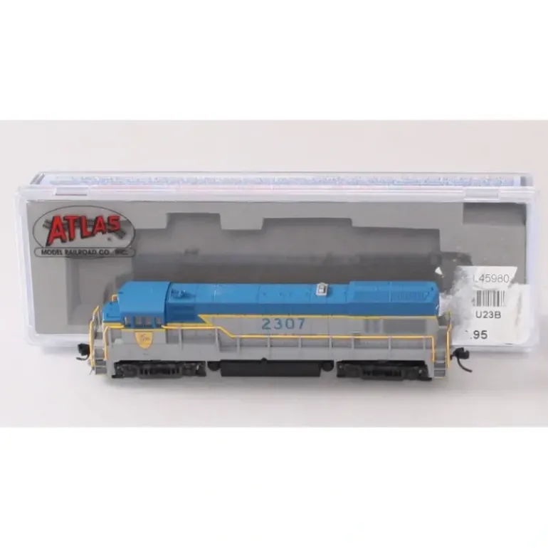 Here is an Atlas 45980 N Scale Delaware & Hudson U23B Diesel Locomotive #2307. Powered by a V12 FDL prime mover, the 2250 h.p. U23B was GEs intermediate-sized four-axle road-switcher of the late 1960s through the mid 1970s. The U23Bs direct competitor during this period was the very successful EMD GP38. In 10 years of production from 1968 through 1977 a total of 481 units were produced, making this the second best seller of GEs Universal Series locomotives. The first units were delivered to the Delaware & Hudson in August and September 1968. CSX predecessors Chesapeake & Ohio and Louisville & Nashville had a combined fleet of 120 units, giving CSX one of the larger active fleets in later years. Penn Central, Santa Fe and Missouri Pacific also purchased sizeable fleets of U23Bs. Primary spotting features include a stepped-out radiator section and two sets of three tall engine access doors near the center of the long hood. During production, the U23B was equipped with various truck side frames, including Blomberg trucks from EMD trade-in locomotives, AAR-style trucks, or GEs own four-axle FB2 truck. One of these three truck styles is included on our model where appropriate per road name.