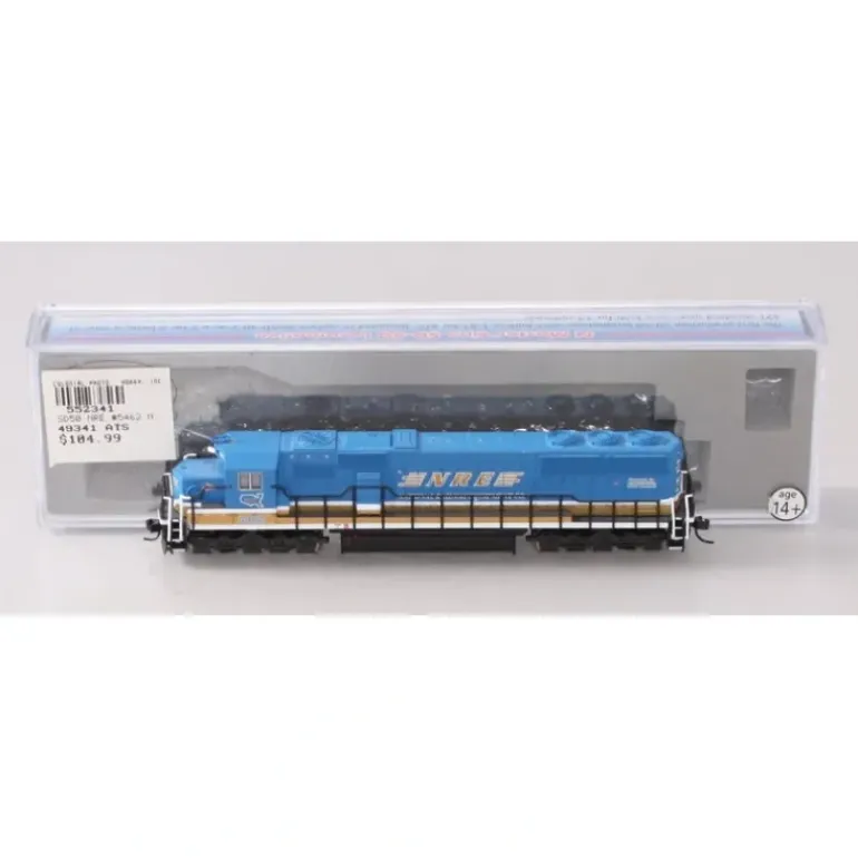 EMD introduced the SD-50 in the early 1980s with a 16 cylinder, 3500 h.p. engine to attain the power that they had early gotten from a 20 cylinder locomotive. The new, longer frame allowed the dynamic brake resistors to be relocated to a cooler area found between the central air intake and the cab. The SD-60 varied little from its predecessor visually, the main changes taking place internally with the aging 645F engine being replaced by the 710G. The two locomotives can be distinguished by the door panels; the SD-50 features four latched doors in six door panels whereas the SD-60 has six latched doors in eight door panels. The wide nose or safety cab was first offered as an option to US railroads in 1988. Union Pacific received the first units in early 1989. In 1991, the contour of the nose was changed slightly, going from a 3-piece to 2-piece windshield and tapering the sides of the nose to improve visibility for the crew. Burlington Northern was the first recipient of the revised model. Features: Directional lighting, Separate plow and winterization hatch that can be installed by the modeler, Blackened wheels, Slower speed motor for closer to scale speeds, AccuMate magnetic knuckle couplers, Golden-White LEDs. AccuMate couplers are made under license from AccuRail, Inc.(Technical artwork and models from previous run shown)