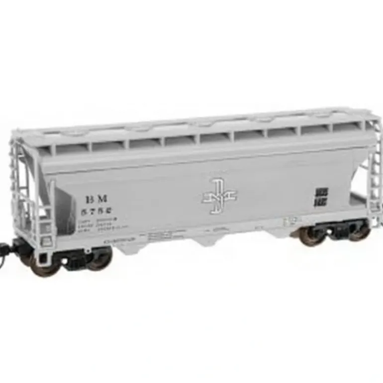 The three-compartment ACF 3560 Center Flow Covered Hopper was designed for the transport of high-density dry bulk ladings of 50 60 pounds per cubic foot. Examples these of commodities includes salt, fertilizer, starch, bauxite, and clay. The 100-ton car was designed to fit into the smallest modern plate diagram dimensions, Plate B. Features: V-frame endsSide sheet weld seamsRoping staplesFive roof hatchesBody mounted brake gearTrue scale dimensions with accurate detailsWeighted, detailed underframesEquipped with AccuMate knuckle couplers