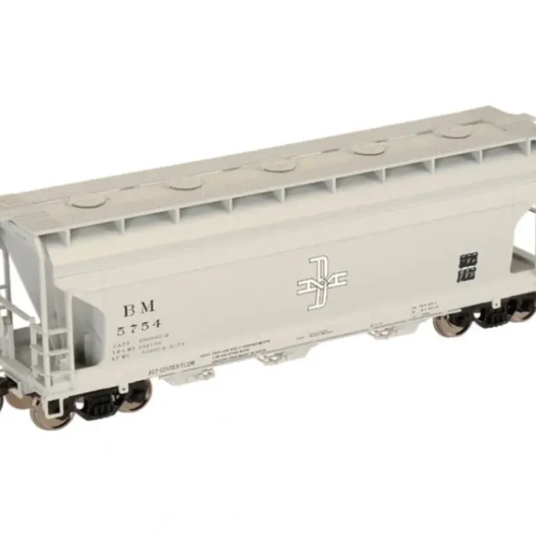 The three-compartment ACF 3560 Center Flow Covered Hopper was designed for the transport of high-density dry bulk ladings of 50 60 pounds per cubic foot. Examples these of commodities includes salt, fertilizer, starch, bauxite, and clay. The 100-ton car was designed to fit into the smallest modern plate diagram dimensions, Plate B. Features: V-frame endsSide sheet weld seamsRoping staplesFive roof hatchesBody mounted brake gearTrue scale dimensions with accurate detailsWeighted, detailed underframesEquipped with AccuMate knuckle couplers