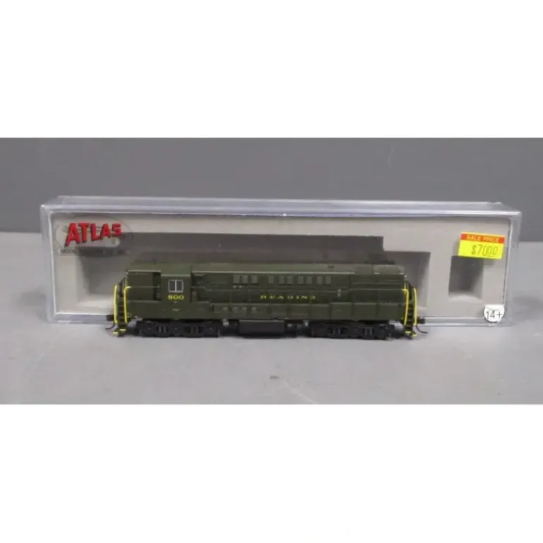 This is Atlas N Scale Ready-to-Run Train Master Phase 1B – Reading #800. Features: Ends with large number boards and a single headlight Golden-white LED’s Directional lighting Painted safety rails Etched metal grilles Blackened metal wheels Scale Speed motor Factory-installed AccuMate magnetic knuckle couplers. Additional Information: The N scale locomotive is based on one of the most popular locomotives ever-Fairbanks Morse’s 2400 horsepower, single engine, six-axle Train Master. It has the same reliable, high performance mechanism and incredible details as all Atlas N scale locomotives.