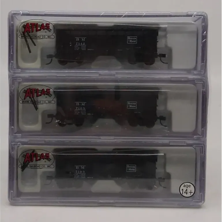 Here is a Set of 3 Atlas 5616 N Scale Boston & Maine 2-Bay Offset Hoppers. These cars feature plastic cosntruction, plastic trucks, operating knuckle couplers, and plastic wheels. Please see pictures for included cars.