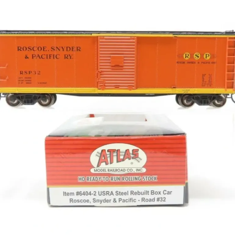 Here is an Atlas 6404-2 HO Scale Roscoe Snyder & Pacific USRA Steel Rebuilt Boxcar #32. These cars feature plastic construction, plastic trucks, knuckle couplers with metal wheels and axles.