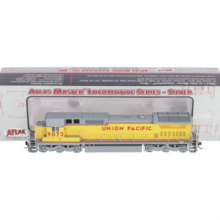 Here is an Atlas 7646 HO Union Pacific “Baby Wings” Dash 8-40C Diesel Locomotive #9037. First built for Union Pacific in the late 1980’s by General Electric, the DASH 8-40C diesel locomotives were identified by an enlarged exhaust stack and the mounting of the dynamic brake grids in a square-like unit behind the cab, which housed an enlarged equipment blower fan. These six-axle, 4,000 hp engines are still in service today in North America.