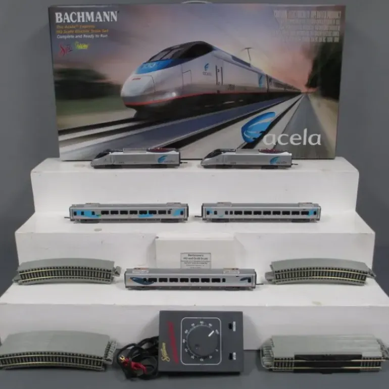 This set features dual Acela Express Locomotives (powered and non-powered) with operating directional lights, markers, ditch lights, operating pantographs, die-cast chassis, die-cast gear towers, opening doors, metal wheels and axles. Three passenger cars with lighted interior, Spectrum po