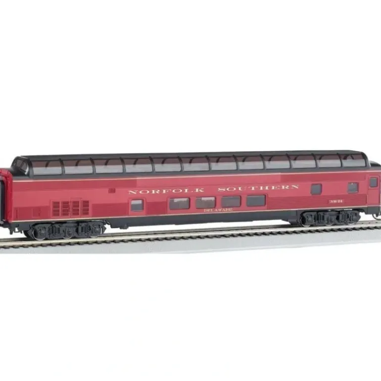 Here is a Bachmann 13047 HO Norfolk Southern Budd 85′ Full-Length Dome w/Lights. This car features plastic body construction, metal wheels, knuckle couplers and interior lighting.