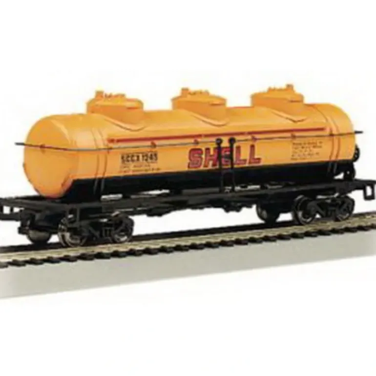 This is Bachmann 17134 HO Shell Oil Company 40′ 3-Dome Tank Car Features includes blackened metal wheels, body mounted couplers, non-magnetic axles.
