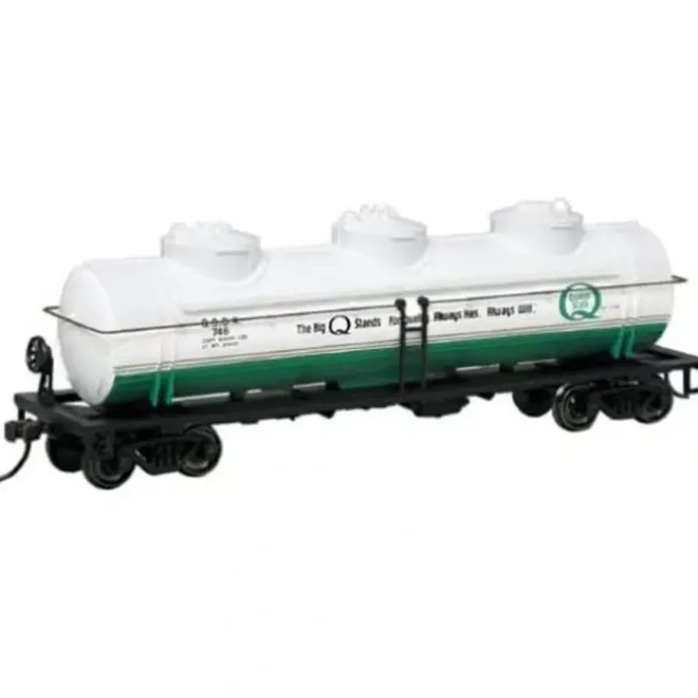 This is Bachmann 17137 HO Quaker State 40′ 3-Dome Tank Car Features includes blackened metal wheels, body mounted couplers, non-magnetic axles.