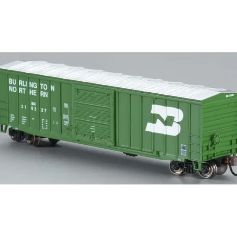 This is Bachmann 19656 N Burlington Northern ACF 50′ with Sliding-Door Boxcar. Its features are: Operating sliding doors 100-ton roller-bearing trucks, Metal wheels, Prototypical graphics, Detailed underframe, Optional tack boards included E-Z Mate Mark II couplers. Painted in cascade green and have a large logo.
