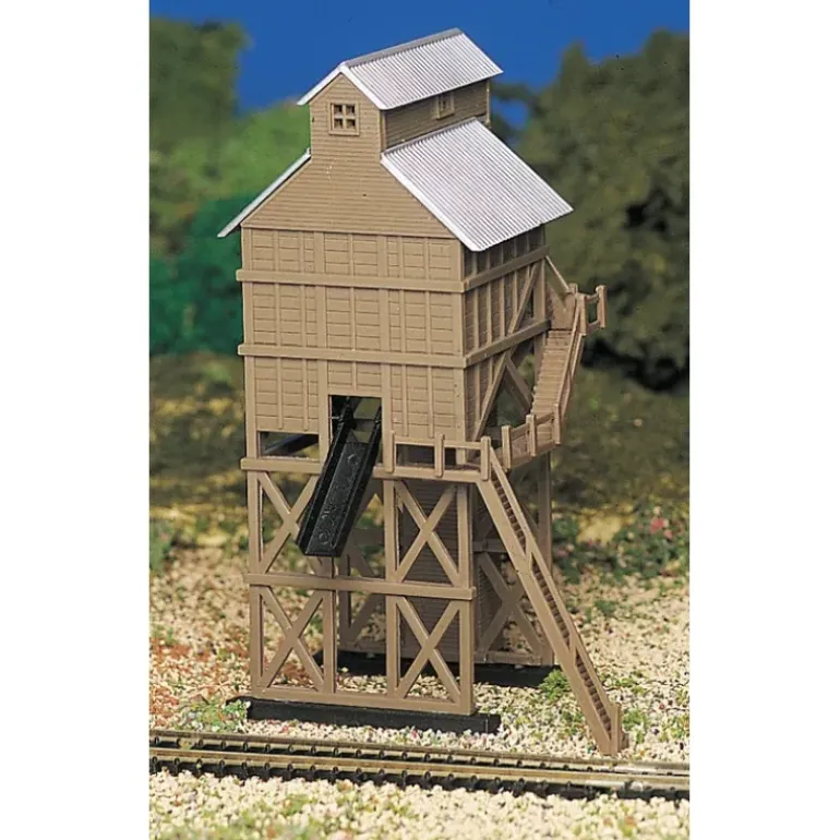 This is Bachmann 45811 N Coaling Station w/figure. Features includes super detailed, hand-decorated, completely assembled model. Ready-to-use on any N scale model, plastic construction, coaling station has several flights of very steep stairs, which feature two figures on them. Station is all brown with a silver tin roof and black coal chutes.