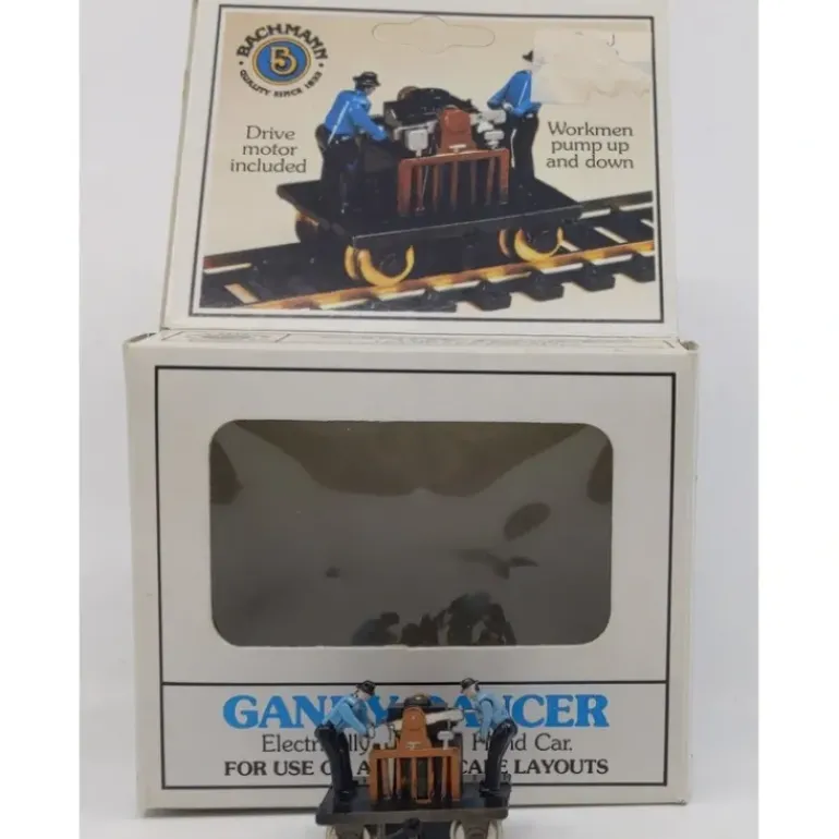 This is Bachmann 46202 HO Gandy Dancer Operating Hand Car. Features includes compatible with any HO scale electric track and equipment, self-powered, motorized hand car, geared metal drive wheels, die cast metal hand car with crank, hand car comes in an assortment of colors: red, yellow, green. Two pre-painted figures on each side of the car.