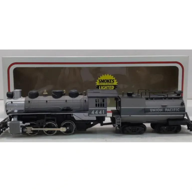 This is Bachmann 50701 HO Union Pacific USRA 0-6-0 w/Vanderbilt Tender & Smoke #4441. Features includes, a DC motor, fully assembled, weighted, operating smoke unit, repainted and lettered plastic body, operating headlight and E-Z Mate(R) knuckle couplers. Two-tone gray Greyhound.