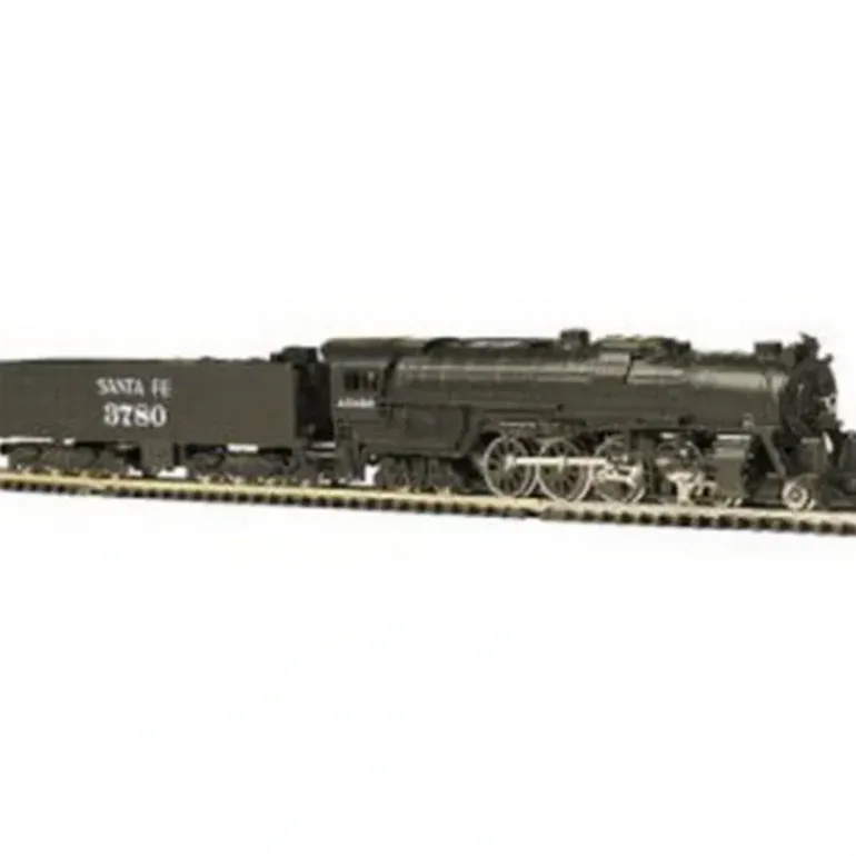 Here is a Bachmann 58052 N Scale Santa Fe 4-8-4 Steam Locomotive & 52′ Tender #3780. Features include plastic construction, plastic trucks, rapido couplers, metal wheels & axles, headlight, and a motor.