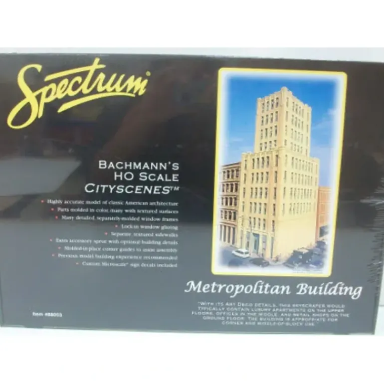 This is a Bachmann 88003 HO Spectrum Metropolitan Building Kit. Features include Highly accurate model of classic American achitechture, parts molded in color, many detailed parts, separate textured sidewalks, molded-in-place corner guides, and Custom Microscale sign decals included.