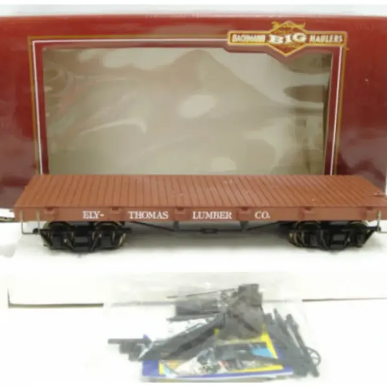 Here is a Bachmann 95627 Ely-Thomas Flatcar with Stakes. This car features removeable stakes, plastic trucks, operating knuckle couplers, metal wheels and axles.
