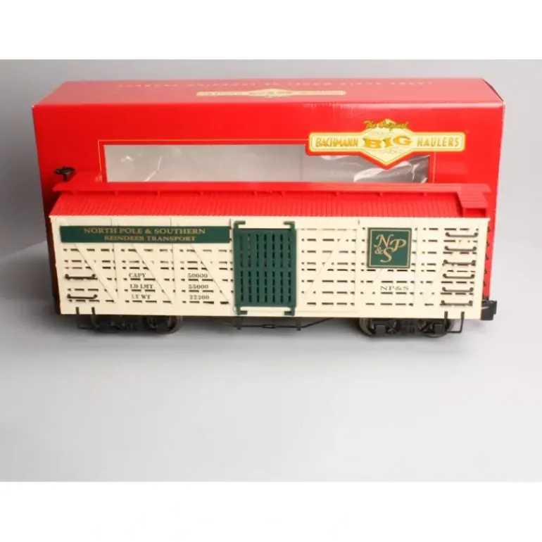 This stock car features sliding doors, plastic trucks, operating knuckle couplers, metal wheels and axles, and a detailed underframe. It measures approximately 15″ long and includes a hook and loop coupler conversion kit.