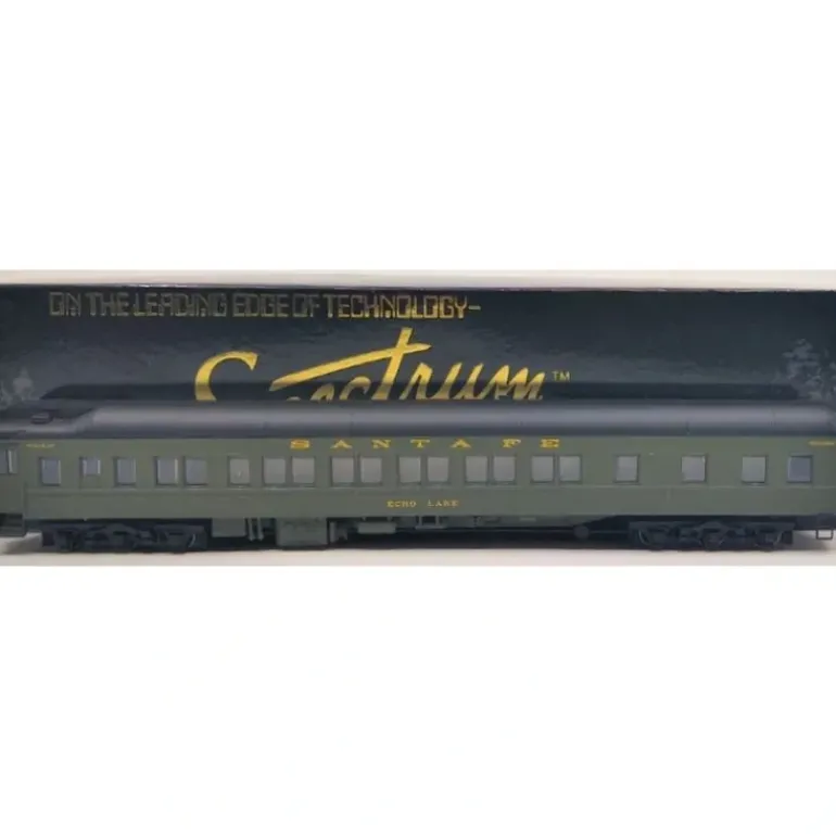 Here is a Bachmann Spectrum 89147 Santa Fe “Echo Lake” Heavyweight Pullman Passenger Car. Features include plastic trucks, detailed interior with lights, knuckle couplers, and it measures approximately 11 inches long.