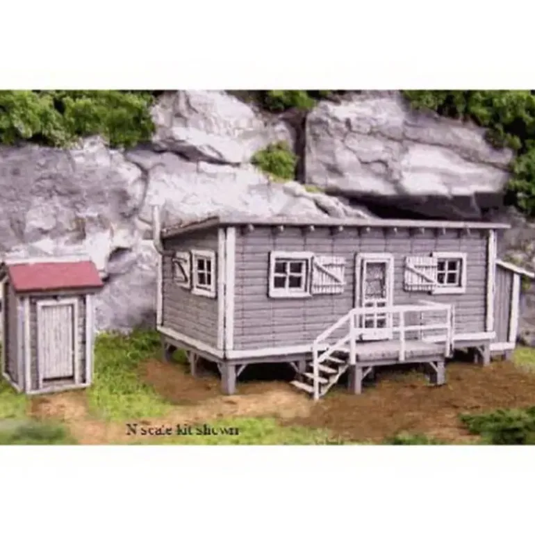 This is a Blair Line 1000 N Scale Laser-Cut Joe’s Cabin and Outhouse Kit. It features easy to assemble pieces and complete instructions.