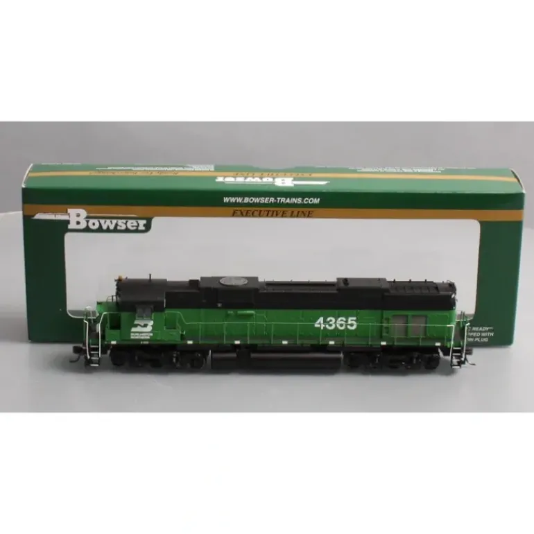 This is a Bowser 24389 HO Scale Burlington Northern Alco Century C-636 Locomotive with no Snow Shield #4365. It Features: Flywheels, RP-25 wheel flanges, Kadee metal couplers, Railroad specific details, Flashing beacon when appropriate, Numbered, With DCC and Sound or DC and 21 pin plug for easy DCC module installation.