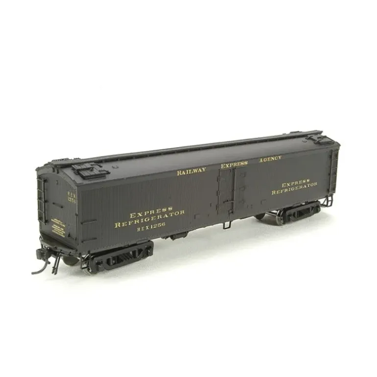 This is a Broadway Limited 1480 HO Scale Railway Express Agency REX Paragon Series General American (GACX) 53’6 Wood Express Reefer 2-Car Set #1502, 1698 (Pullman Green). Express reefers were designed to haul perishable goods to market fast. NormAlly operated at the front of passenger trains, GACX 53′ 6 wood refrigerator cars were the most commonly used cars in the U.S.from the 30s through the 50s. These ready-to-run models feature a plastic body with metal wheels and axles, 2 operating knuckle couplers, operating doors and factory applied hand grabs. All cars can be operated on code 70, 83 and 100 track.