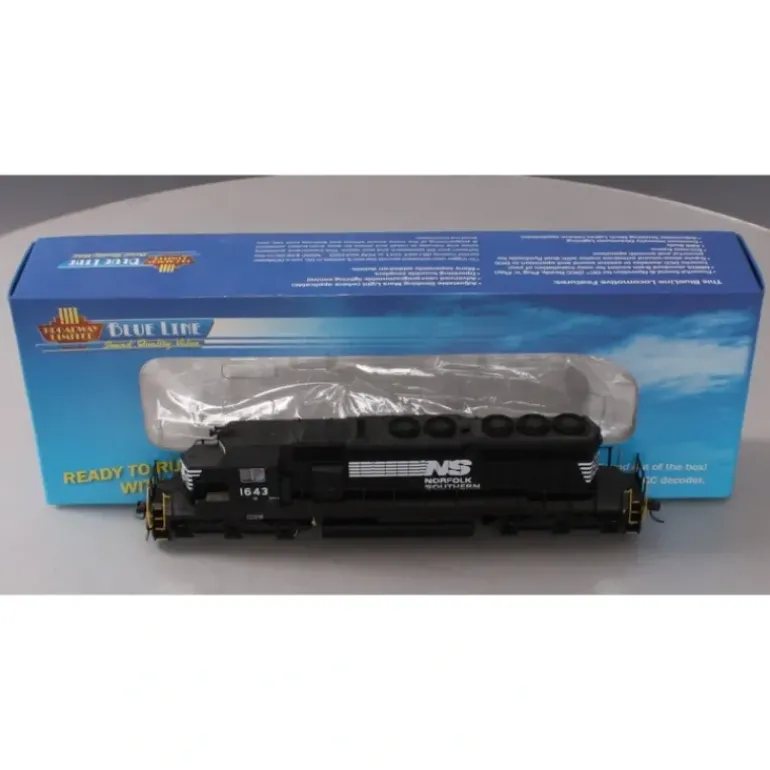 This is a Broadway Limited 5012 HO Scale Norfolk Southern EMD SD40-2 Low Hood with Sound – Standard DC – Blue Line #1643. This item features plastic trucks, motor, metal wheels, and operating knuckle couplers. Please see my pictures for additional features.