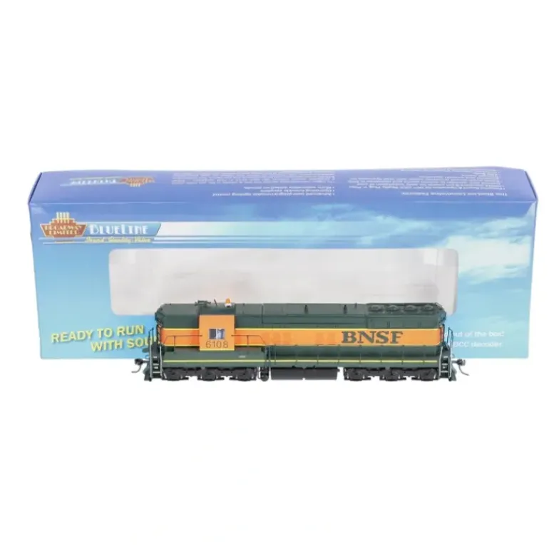 Here is a Broadway Limited 5292 HO Burlington Northern Santa Fe EMD SD9 with Sound #6108. It features a plastic body construction, plastic trucks with metal wheels, operating knuckle couplers and a motor.