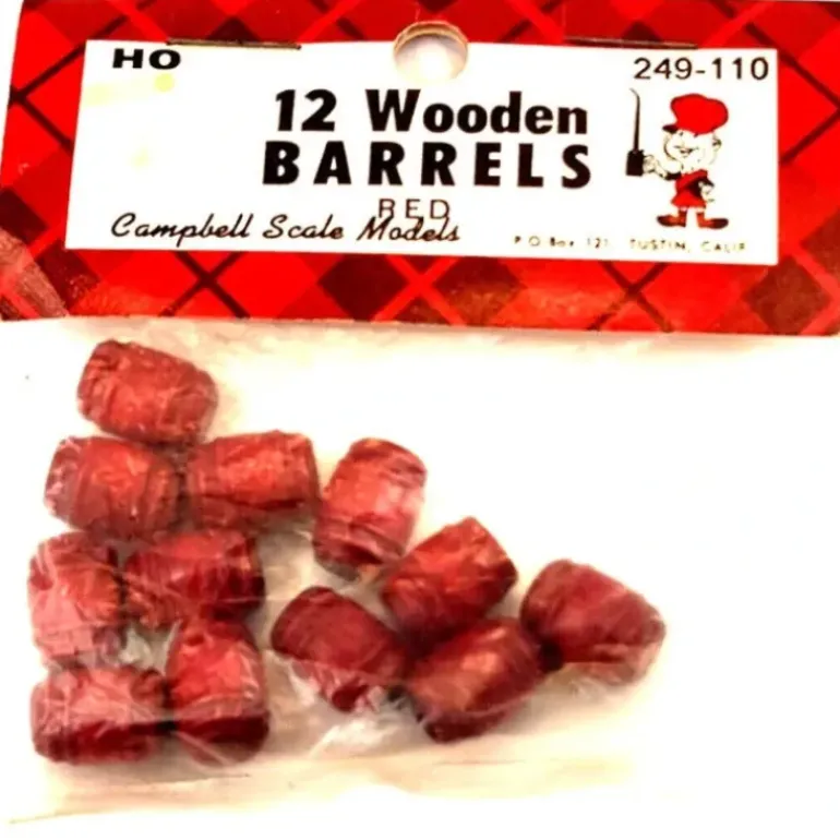 This is a Campbell Scale Models 249-110 HO Scale Red Wooden Barrels (Pack of 12).