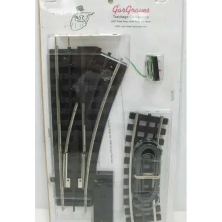 This is a Gargraves 113-RH O-42 Right Hand Remote Control Switch. Features include the blackened Phantom center rail with tinplated outside rails and plastic ties. Also included is a makeup curve to bring your spur back parallel to the main line at 4.21. Switch is 9.5 long.