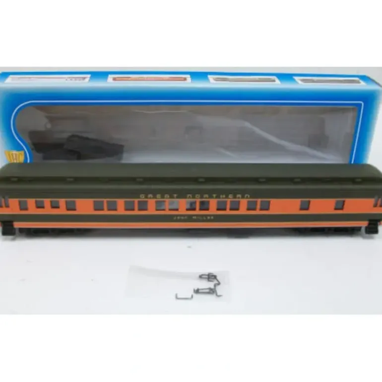 Here is a Great Northern John Miller 12-1 sleeper car that features plastic truck sides, plastic horn hook couplers, plastic wheels with metal axles, a detailed plastic shell and underframe with brake system and user-installed separate detail parts. It measures approximately 11″ long.