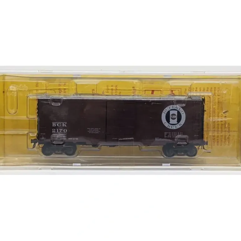 This is a Kadee 4906 HO Scale Buffalo Creek Road 40′ PS-1 Boxcar #2170. It features plastic construction, metal wheels & knuckle couplers.