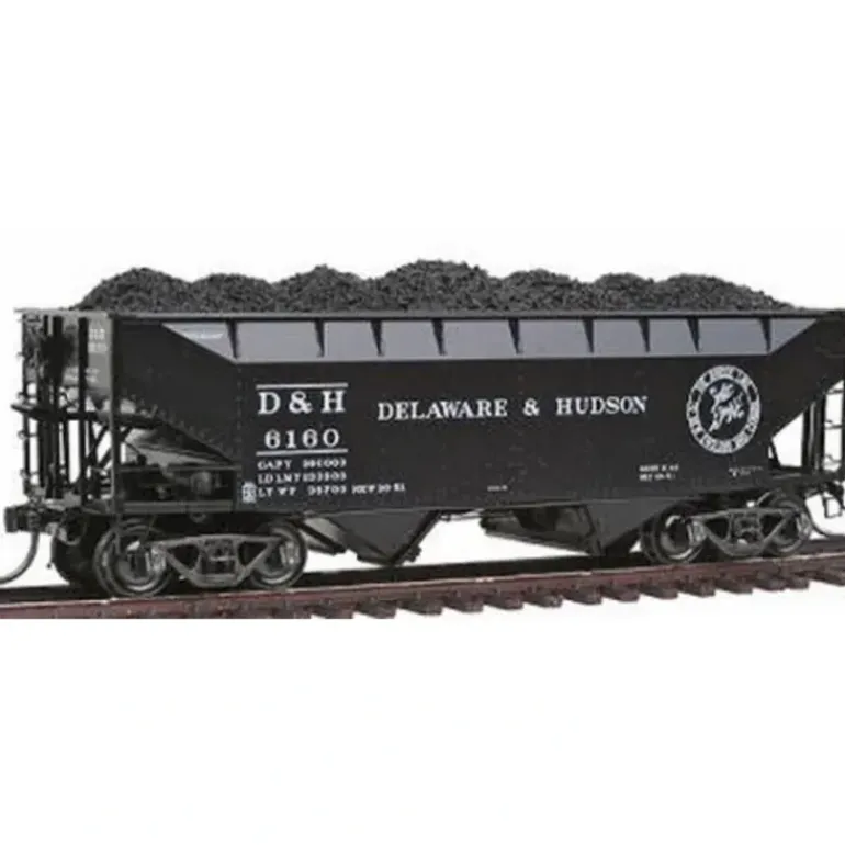 This is a Kadee 7034 HO Scale 50-Ton AAR Standard Offset 2-Bay Open Hopper with Coal Load – Assembled Delaware & Hudson #6160 (black). This hopper features: plastic construction, intricately realistic detail, metal wheels, and metal couplers.