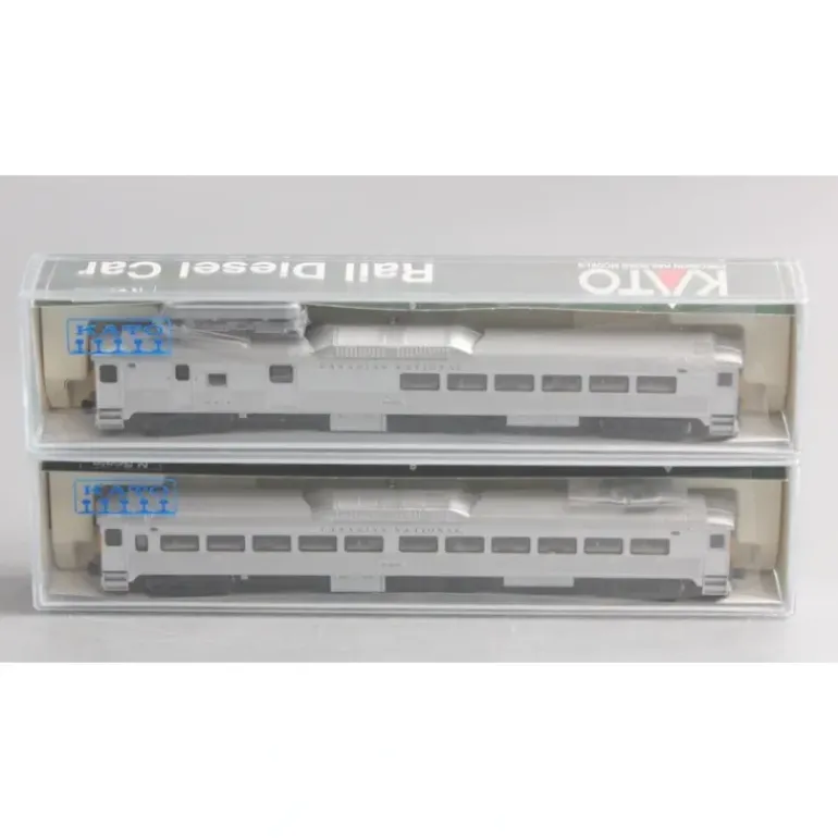 Here is a Kato 106-3002 CN RDC1 #D200 & RDC3 #D101 – Set A. Commonly known as the RDC, the motorized Rail Diesel Car generally operated in rural areas where ridership and mail/parcel transport were too low for regular passenger train service. When first introduced, the RDC was proclaimed to be the savior of branch line and suburban service. It was heavily used as a commuter service workhorse (and still is currently in some locations!). Capable of being operated by a motorman from either end of the car, these units could be used independently or combined into a multi-unit. All models are motorized, have LED directional headlights, and KATO magnetic knuckle coupers. Interiors can be lighted with the optional #11-209 & #11-210 Interior Light Kit with White LED or #11-204 & #11-206 Interior Light Kit with bulb.
