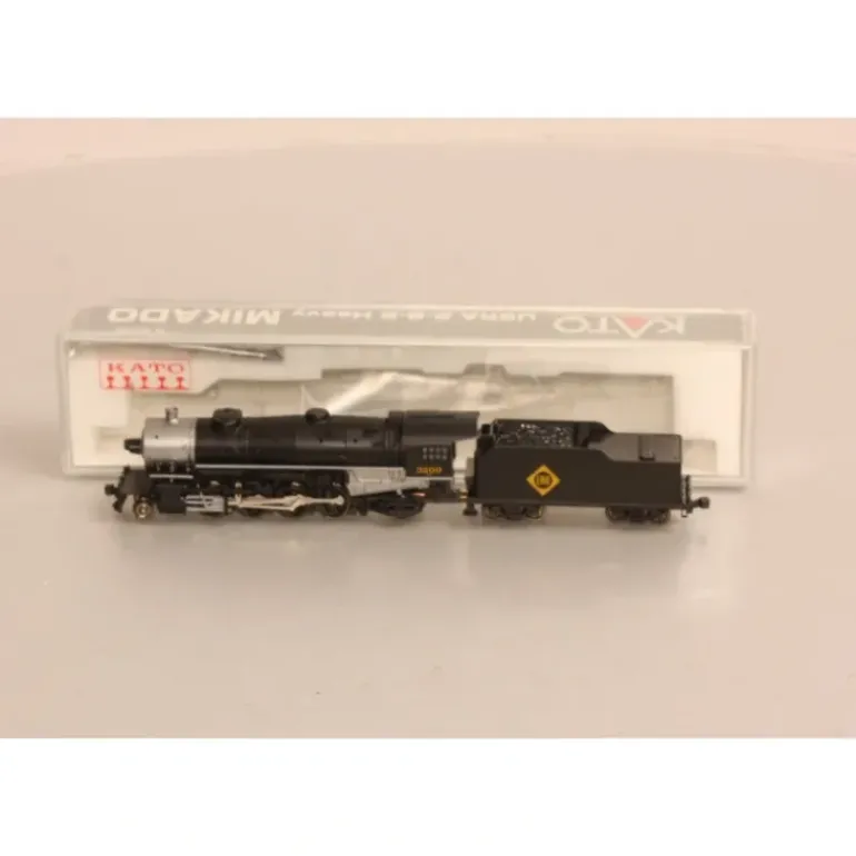 Here is a Kato 126-0201 Erie USRA 2-8-2 Heavy Mikado Steam Locomotive and Tender #3200. This locomotive features a die cast frame, detailed plastic shell, precision motor, operating headlamp, plastic couplers, and metal wheels.