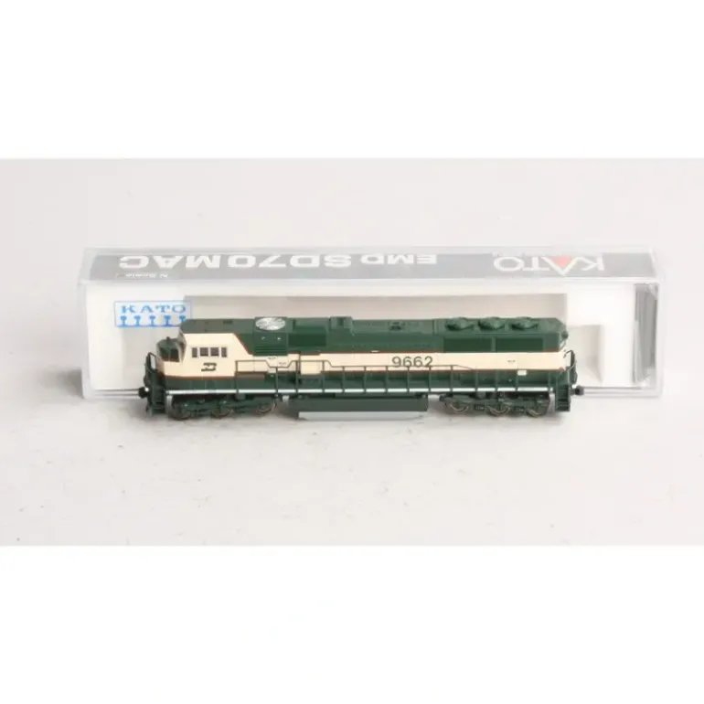 The General Motors Locomotive Group (GMLG) Electro-Motive Division (EMD) SD70MAC is one of the most common locomotives plying the rails today. Originally introduced in late 1993 with an order for the Burlington Northern, the production now totals over 900 units, exceeding the combined production of the SD80MAC and SD90MAC locomotives by over 300 units. At this time, the SD70MAC, in all of its versions, has been operated by six different railroads in a total of eight different paint schemes. The railroads that operate this locomotive span from East to West and from Mexico to Alaska! Model Information: These models will be equipped with all-wheel electrical pick-up and blackened metal wheels in trucks that replicate the HTCR Phase II trucks. (On the prototype, this truck evolved from the HT-C trucks found on the SD40-2 through SD60 and features radial steering capability). Additionally, the models will feature walkway-mounted, lighted ditch lights! Handrails will be made of a paintable material so modelers can easily add white end railings. Powerful five-pole KATO motor with dual brass flywheels, Directional Headlight and illuminated, preprinted numberboards, Kato magnetic knuckle coupler, DCC Friendly mechanism ready for drop-in decoder installation.