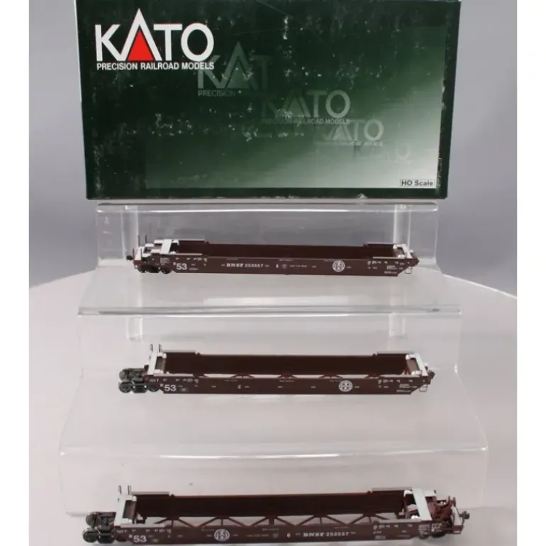 Here is a Kato 30-9013 HO BNSF MAXI IV Wellcar #253557. Intermodal container service is one of the most popular types of freight service on rails today. The Maxi-IV car is the mainstay of the U.S. domestic double-stack car fleet. Providing an optimum balance between tare weight and capacity, the Gunderson MAXI-IV is a 3-unit articulated double-stack car that can handle containers from 20-foot to 53-foot long in the well and containers 40-foot to 57-foot in the top, or double-stacked, position. As of a result of its versatility and sturdy construction, the MAXI-IV is now the mainstay of the U.S. domestic double-stack fleet. The popularity of this car on North American rails is underscored by its popularity with model railroaders today! Model Information: The powerful appearance of this articulated car will be achieved using a metal injection-molded frame, enhanced by the extensive detail of piping and patterned running boards. Like the prototype, the model will feature two different sized wheels! The two end trucks will have 33 scale wheels while the two middle trucks will have 38 scale wheels. (This is done on the prototype for weight bearing reasons, with the greater weight of the load being borne by the wheels of the mid-car trucks than by the wheels of the trucks on each end.) Model Features: Provides stable operation with or without container loads due to Kato’s new innovative heavier material steel compound plastic used for the construction of the well car. Each container (Sold Separately) has a magnet and a metal plate to hold it securely to the well car bottom or to the top of the lower Kato container