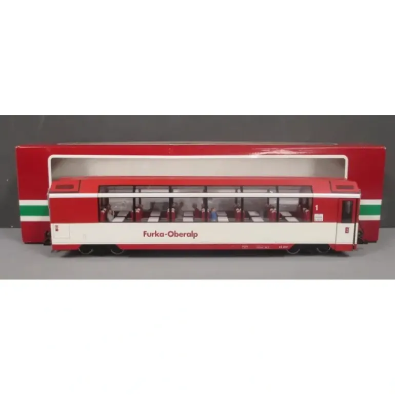 This is an LGB 30660 Furka-Overlap Panorama Passenger Car. Features include plastic construction, plastic trucks, latch couplers, a furnished interior with passenger figures, metal wheels and axles. It measures 24 1/2 inches long.