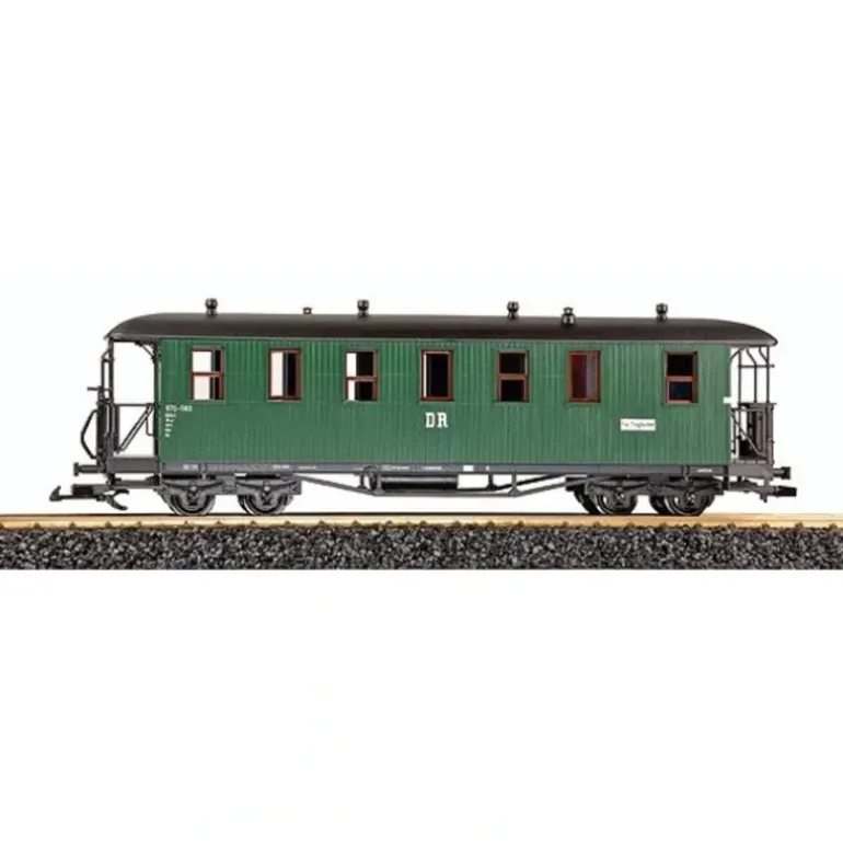 This passenger car features plastic trucks, plastic LGB type couplers, and plastic wheels and axles.